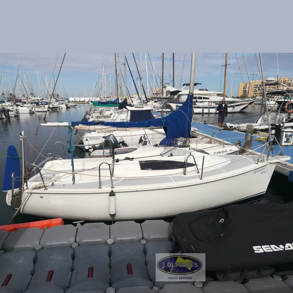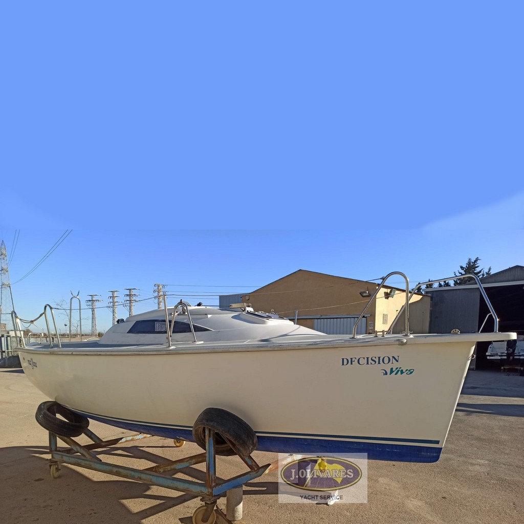 Decision 21 de 2003 en buen estado, equipada con motor Mercury 6 CV de 2022, mayor con contra y génova nuevo con enrollador. Dispone de orza abatible, escalera de baño, asientos en bañera y espacio interior con camarote y 2 camas. Lista para navegar.